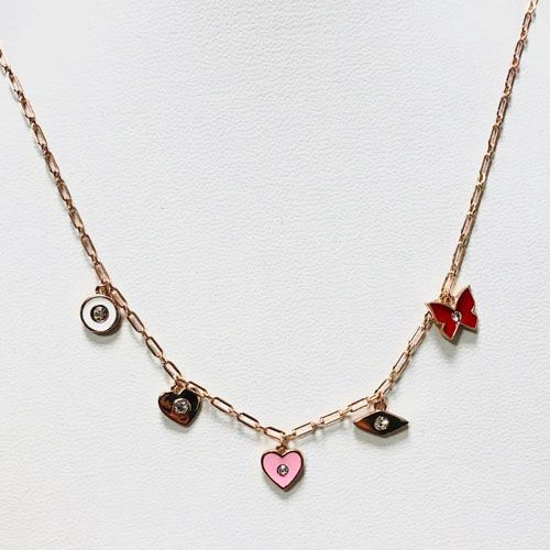 Conjunto bañado en oro con dijes love, medalla, alas y mano.